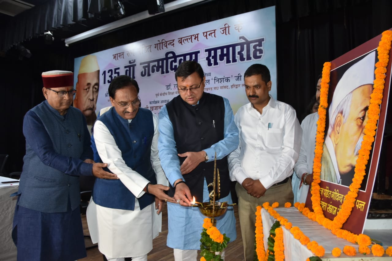 मुख्यमंत्री पुष्कर सिंह धामी ने सर्वे चौक स्थित आई.आर.डी.टी. सभागार में भारत रत्न पं. गोविन्द बल्लभ पंत जी के 135 वें जन्मदिन समारोह कार्यक्रम में प्रतिभाग किया। इस अवसर पर उन्होंने पं. गोविन्द बल्लभ पंत जी के चित्र पर श्रद्धासुमन अर्पित कर उन्हें श्रद्धांजलि दी