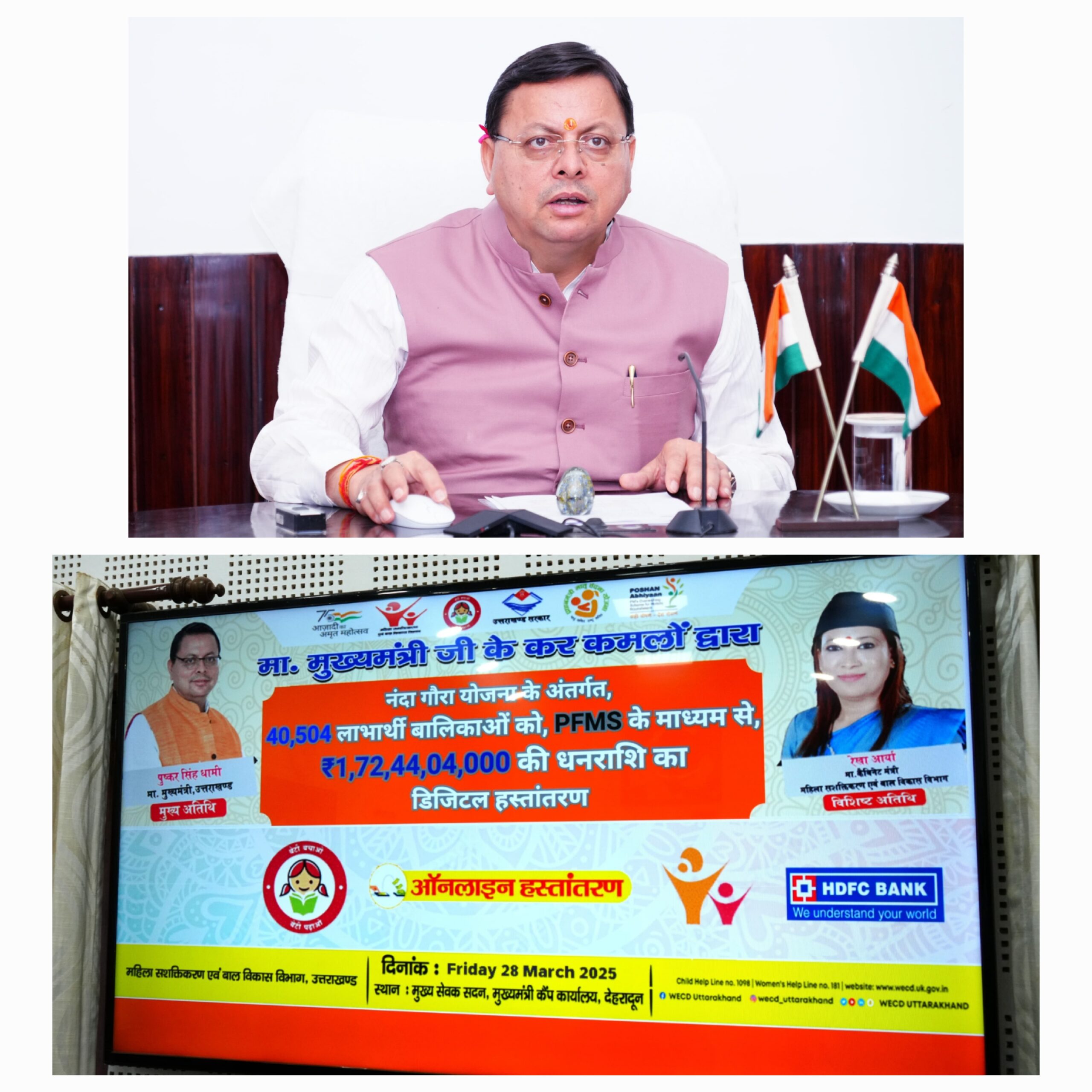 मुख्यमंत्री श्री पुष्कर सिंह धामी ने शुक्रवार को मुख्यमंत्री कैंप कार्यालय से डीबीटी के माध्यम से नंदा गौरा योजना के 40 हजार 504 लाभार्थियों को वित्तीय वर्ष 2024-25 में लाभान्वित 01 अरब 72 करोड़ 44 लाख 04 हजार रुपए की धनराशि का वितरण किया। इस योजना के माध्यम से विगत 05 वर्ष में 02 लाख 84 हजार 559 लाभार्थियों को कुल 09 अरब 68 करोड़ 64 लाख 51 हजार की धनराशि डीबीटी के माध्यम से प्रदान की गई।