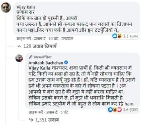 - इसके अलावा मामले में अमिताभ बच्चन के कुछ फैंस भी गुस्से में थे और उन्हें सुपरस्टार का ये मूव अच्छा नहीं लगा था। अब अमिताभ की तरफ से ऑफिशियल स्टेटमेंट जारी कर दिया गया है। इसी बीच अमिताभ बच्चन से एक फैन ने पान मसाला का एड करने पर सवाल भी किया था। इसके जवाब में अमिताभ ने कहा था कि- ‘अगर किसी संस्था को इससे फायदा हो रहा है तो फिर हमें ऐसे नहीं सोचना चाहिए कि हम ये क्यों कर रहे हैं। जैसे हम लोगों की इंडस्ट्री चलती है वैसे ही उनकी इंडस्ट्री भी चलती है। आपको ऐसा लगता है कि मुझे ये नहीं करना चाहिए लेकिन मुझे इसके लिए फीस मिली है।’