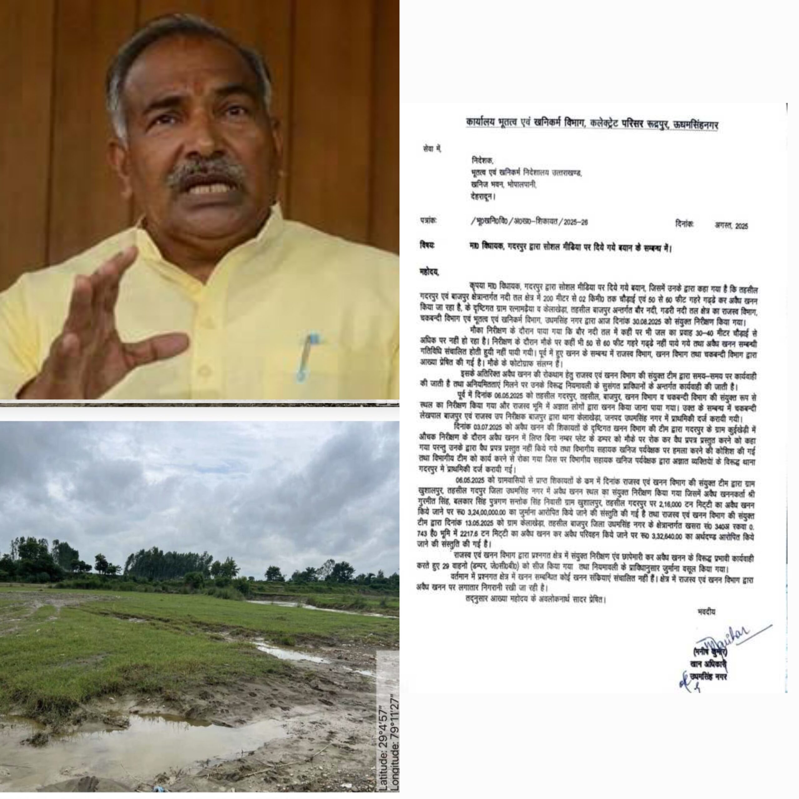 विधायक, गदरपुर अरविंद पांडे द्वारा सोशल मीडिया के माध्यम से तहसील गदरपुर एवं बाजपुर क्षेत्रान्तर्गत नदी तल क्षेत्रों में 200 मीटर से 02 किमी तक चौड़ाई एवं 50 से 60 फीट गहरे गड्ढे कर अवैध खनन किये जाने का आरोप लगाया गया है।