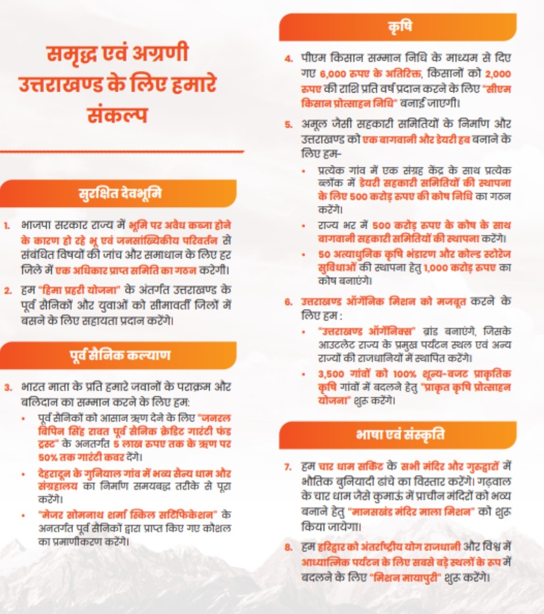 उत्तराखंड में पर्यटन व तीर्थाटन को बढ़ावा देने के लिए पर्वतीय क्षेत्रों में बुनियादी सुविधाएं जुटाने के साथ ही ग्रामीणों को बुनियादी सुविधाएं देने पर खास फोकस हुआ है। शिक्षा, स्वास्थ्य, स्व रोजगार और कर्मचारी वर्ग को रिझाने के लिए पार्टी घोषणा पत्र में ऐलान हुए हैं। पूर्व सीएम तीरथ सिंह रावत, पूर्व केंद्रीय मंत्री डा. रमेश पोखरियाल निशंक, सांसद माला राज्यलक्ष्मी व नरेश बंसल के साथ ही भाजपा के कई दिग्गज मौजूद रहेंगे।