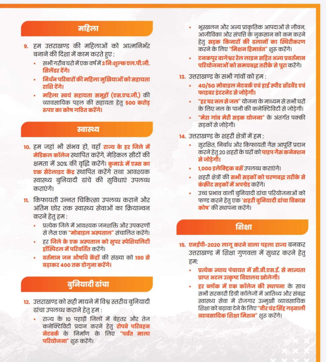 स्वास्थ्य:पर्वतीय जिलों में तैनाती पर डॉक्टरों को विशेष प्रोत्साहन राशि। अस्पतालों व स्वास्थ्य सेंटरों में डॉक्टर्स के रिक्त पदों को भरने का भरोसा। हर जिले में एक मेडिकल कॉलेज खोलने की योजना। प्रत्येक जिले में एक सचल चिकित्सालय।