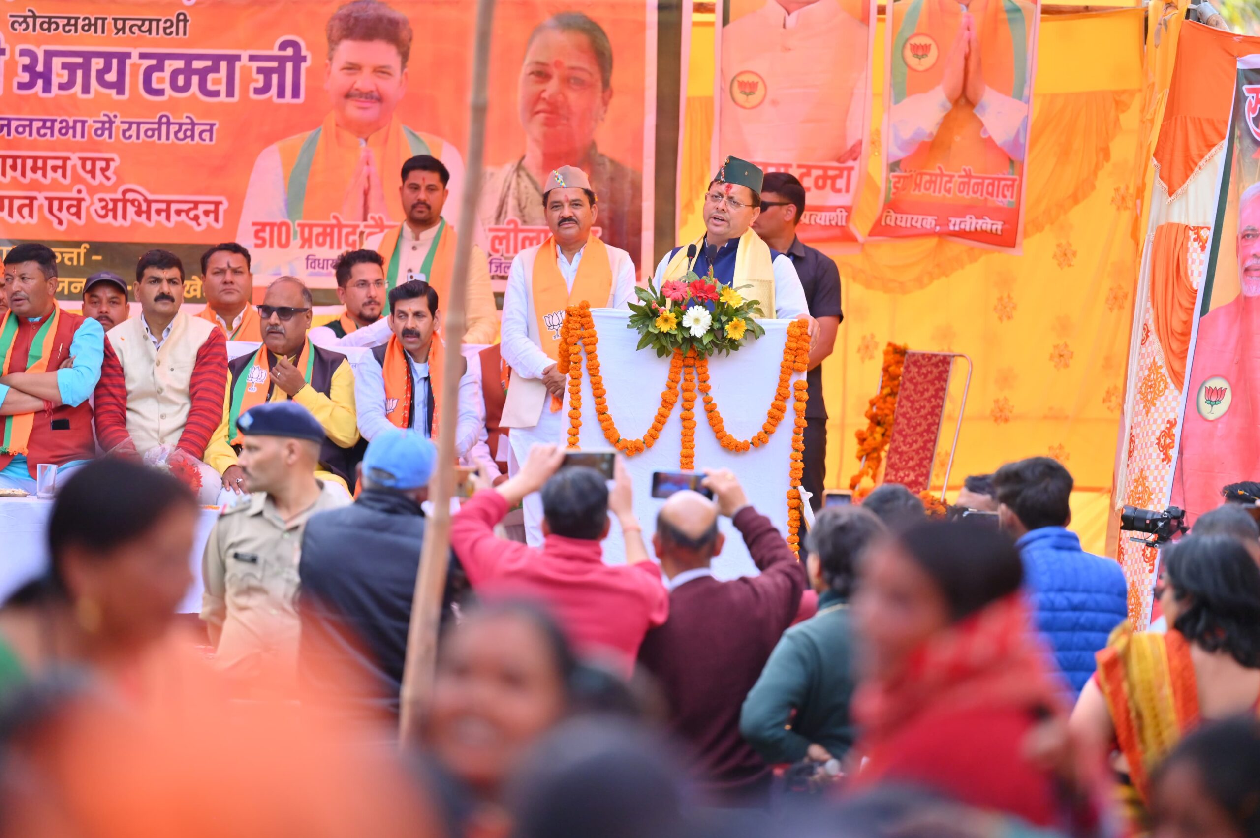 मुख्यमंत्री पुष्कर सिंह धामी ने शनिवार को केएमओयू स्टेशन पार्किंग, रानीखेत में अल्मोड़ा लोकसभा क्षेत्र से भाजपा प्रत्याशी. अजय टम्टा के पक्ष में आयोजित जनसभा में किया प्रतिभाग