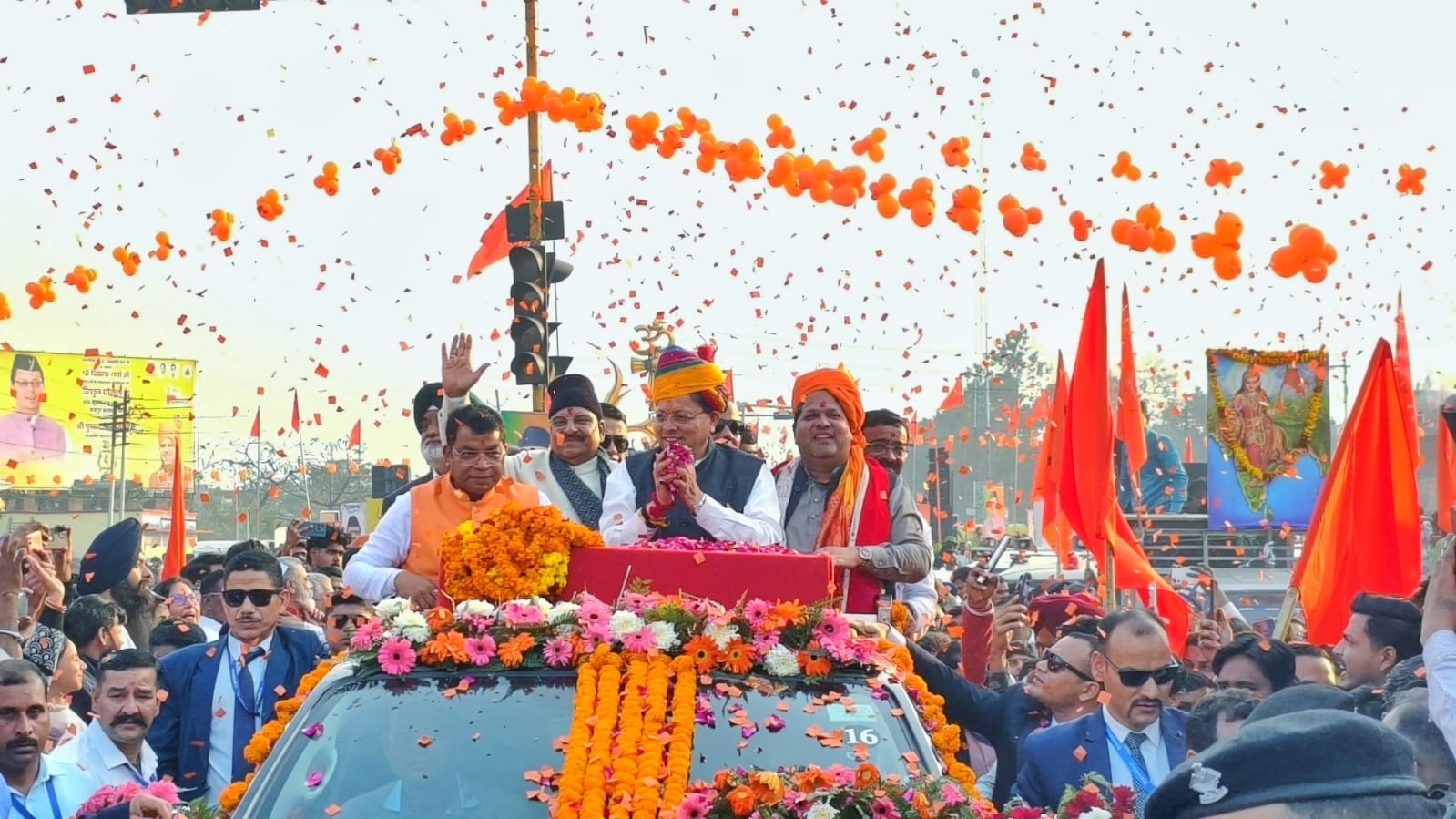 मुख्यमंत्री धामी पर पूरे मार्ग में हुई भारी पुष्पवर्षा, फूलों की पंखुड़ियों से पट गईं सड़कें और उमड़ा जनउत्साह