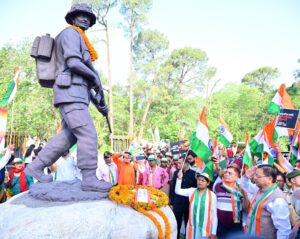 मुख्यमंत्री श्री पुष्कर सिंह धामी के नेतृत्व में बुधवार को शौर्य स्थल चीड़बाग से गांधी पार्क तक भव्य “तिरंगा शौर्य सम्मान यात्रा” का आयोजन किया गया। यह यात्रा हाल ही में भारतीय सशस्त्र बलों द्वारा सफलतापूर्वक चलाए गए “ऑपरेशन सिंदूर” की ऐतिहासिक विजय को समर्पित रही। हजारों की संख्या में आमजन, पूर्व सैनिक, युवा वर्ग एवं मातृशक्ति ने तिरंगे के साथ पद यात्रा में भाग लिया। मुख्यमंत्री ने इस अवसर पर शौर्य स्थल पर पुष्प चक्र अर्पित कर शहीद जवानों को श्रद्धांजलि भी दी।