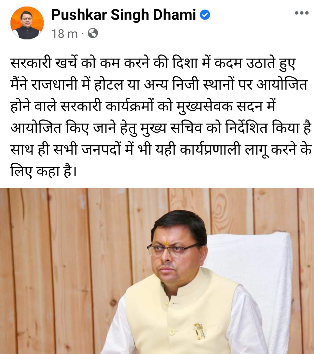 मुख्यमंत्री पुष्कर सिंह धामी ने सरकारी खर्चे को कम करने की दिशा में बड़ा कदम उठाते हुए फैसला लिया है कि राजधानी देहरादून में होटल या अन्य निजी स्थानों पर आयोजित होने वाले सरकारी कार्यक्रमों को मुख्यसेवक सदन में आयोजित किया जाये इसके लिए उन्होने मुख्य सचिव को निर्देशित किया है इसके साथ ही मुख्यमंत्री धामी ने सभी जनपदों में भी यही कार्यप्रणाली लागू करने के लिए कहा है