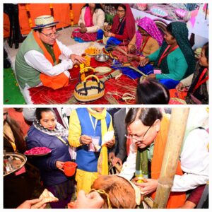 मुख्यमंत्री का कार्यक्रम स्थल के मुख्य गेट पर पांच कन्याओं द्वारा तिलक और पुष्प वर्षा के साथ स्वागत और अभिनंदन किया गया। इस अवसर पर मुख्यमंत्री ने पशुपालन विभाग के स्टॉल पर गिर प्रजाति की गौ माता का पूजन कर जनपदवासियों की खुशहाली, बेहतर स्वास्थ्य और समृद्धि की कामना की। स्टॉलों के अवलोकन के दौरान उत्तराखंड राज्य आजीविका मिशन के स्टॉल पर मुख्यमंत्री ने चरखा में कताई कर स्वयं सहायता समूह की महिलाओं का मनोबल बढ़ाया। उन्होंने विकसित भारत संकल्प यात्रा से लाभान्वित लाभार्थियों के साथ सीधा संवाद भी किया। मुख्यमंत्री ने मिट्टी के बर्तन और तुलसीमाला स्टॉल पर महिलाओं के इस स्वरोजगारपरक गतिविधि की सराहना करते हुए स्वयं भी इस पर अपना हाथ आजमाया और उन्हें इस कला को आगे बढ़ाने के लिए प्रोत्साहित किया। इस अवसर पर मुख्यमंत्री ने नव दुर्गा की प्रतीक कन्याओं का पूजन कर प्रदेश की सुख-शांति, खुशहाली, चहुमुखी विकास की कामना की।