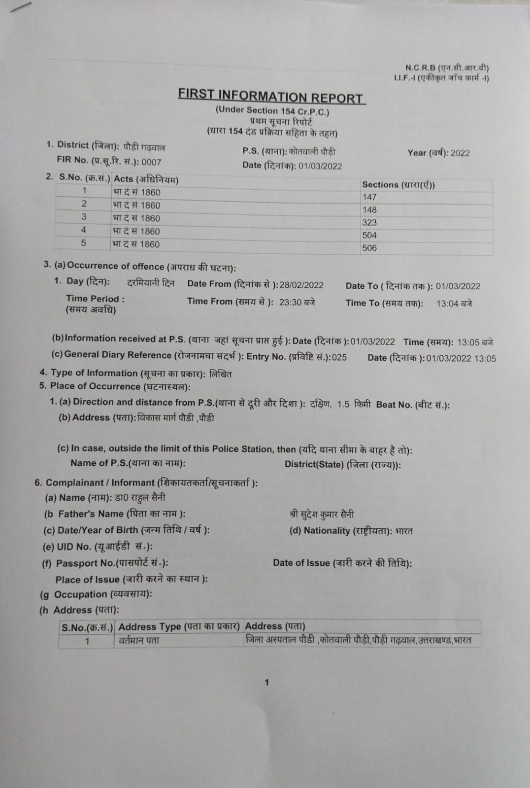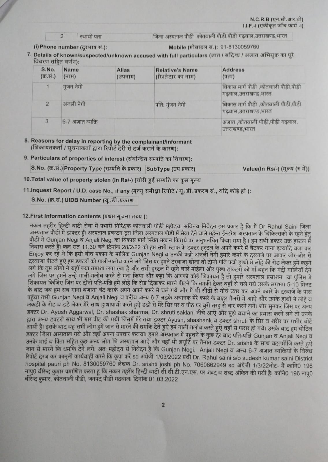 जिला अस्पताल के चिकित्सा अधीक्षक डॉ प्रषांत जैन ने जानकारी दी कि 28 फरवरी 2022 की रात कैलाश पीजी हॉस्टल के स्वामी गुंजन नेगी पुत्र मनवर सिंह नेगी, अंजलि नेगी, गुंजन नेगी के भाई मोंटी नेगी निवासी विकास मार्ग पौड़ी व 6-7 अन्य अज्ञात लोगों द्वारा डॉॅ राहुल सैनी व जिला अस्पताल पौड़ी के अन्य डॉक्टरों पर रॉड व धारधार हथियार से हमला किया गया।