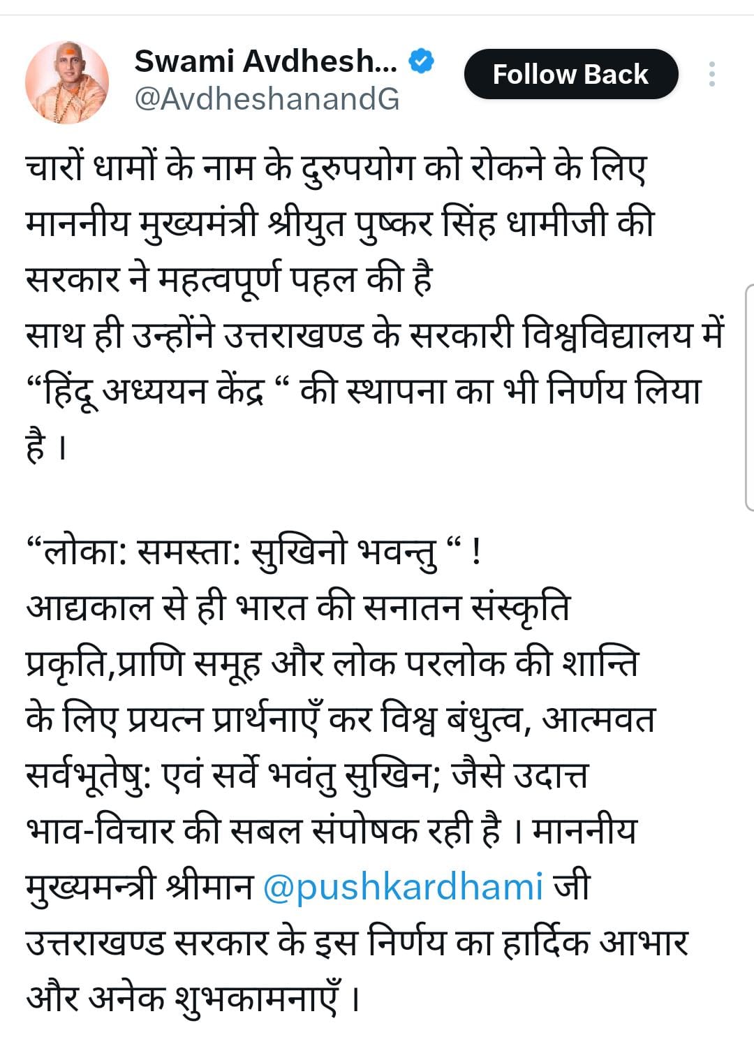 उत्तराखण्ड के सरकारी विश्वविद्यालय में “हिंदू अध्ययन केंद्र ” की स्थापना का निर्णय लेने पर धामी जी हार्दिक आभार व शुभकामनाएं :स्वामी अवधेशानन्द गिरि जी महाराज