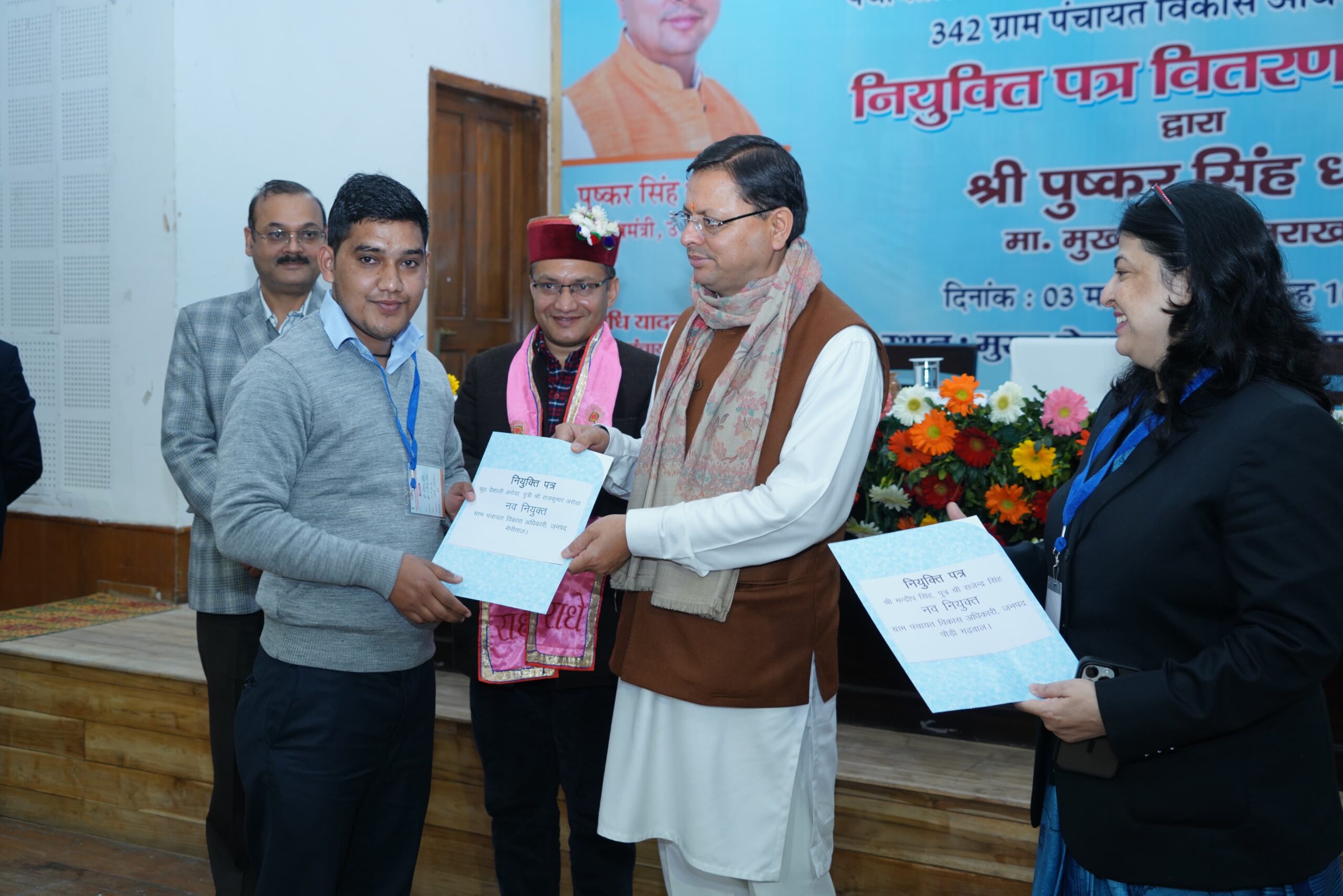 मुख्यमंत्री पुष्कर सिंह धामी ने रविवार को मुख्यमंत्री आवास स्थित मुख्य सेवक सदन में पंचायती राज विभाग द्वारा आयोजित नियुक्ति पत्र वितरण समारोह में पंचायती राज विभाग के 08 सहायक लेखाकारों तथा 342 ग्राम पंचायत विकास अधिकारियों को नियुक्ति पत्र प्रदान किये। सहायक लेखाकारों का चयन लोक सेवा आयोग तथा ग्राम पंचायत विकास अधिकारियों का चयन अधीनस्थ सेवा चयन आयोग के माध्यम से किया गया है।