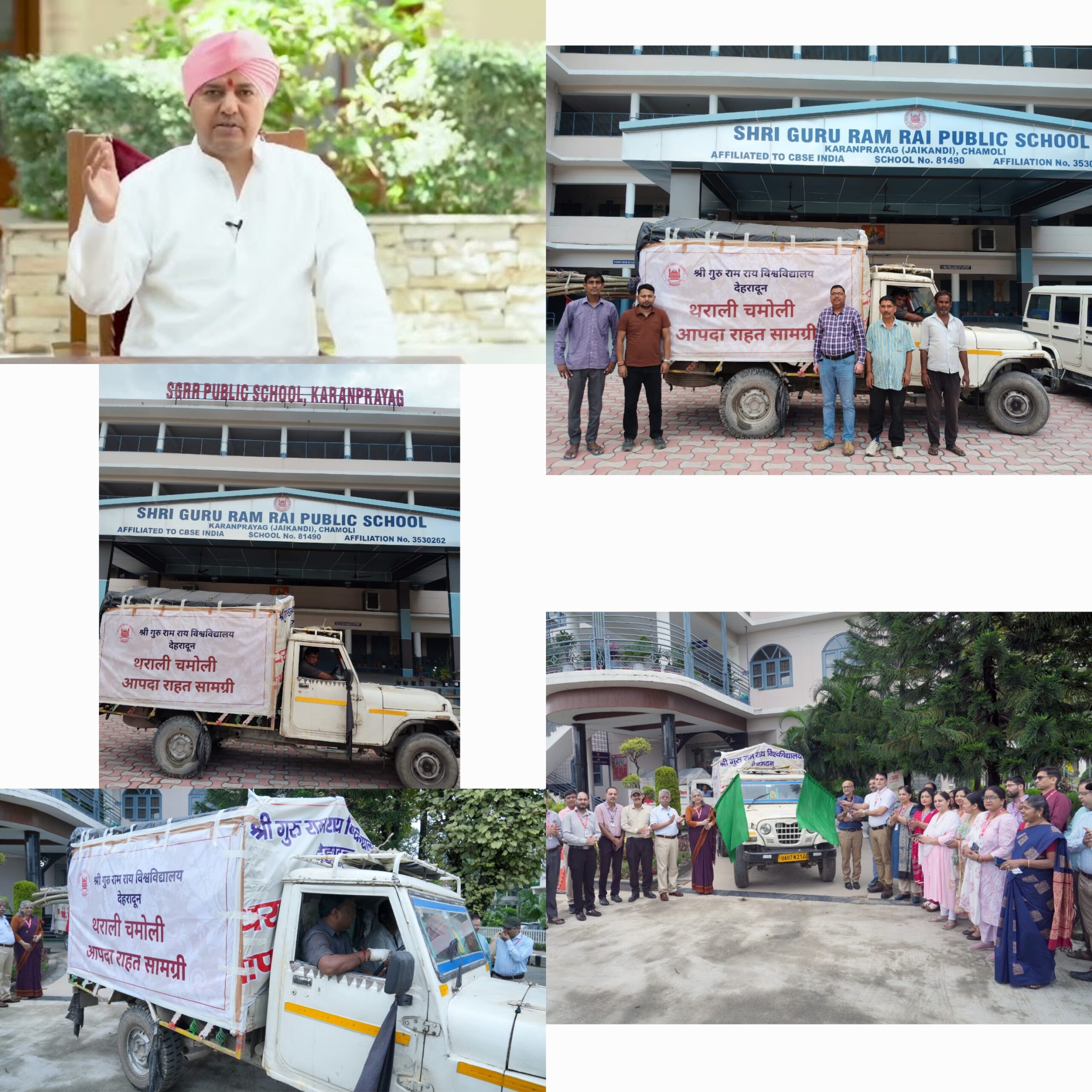 श्री गुरु राम राय विश्वविद्यालय ने थराली (चमोली) आपदा प्रभावितों के लिए राहत एवम् खा़द्य सामग्री भेजी। सोमवार को श्री गुरु राम राय विश्वविद्यालय की कुलपति प्रो. डॉ. कुमुद सकलानी और रजिस्ट्रार डॉ. लोकेश गंभीर ने राहत सामग्री से लदे वाहनों को हरी झंडी दिखाकर रवाना किया। श्री गुरु राम राय विश्वविद्यालय के माननीय प्रेसीडेंट श्रीमहंत देवेन्द्र दास जी महाराज ने कहा कि हम सभी प्रभु से प्रार्थना करते हैं कि प्रभावित परिवारों को शीघ्र ही इस कठिनाई से उबरने की शक्ति प्राप्त हो। उन्होंने चमोली जनपद के अन्तर्गत आने वाले एसजीआरआर ग्रुप के संस्थानों के कर्मचारियों का आह्वान किया कि आप सभी थराली आपदा पीड़ितों की हर सम्भव मदद में अपना योगदान दीजिए।