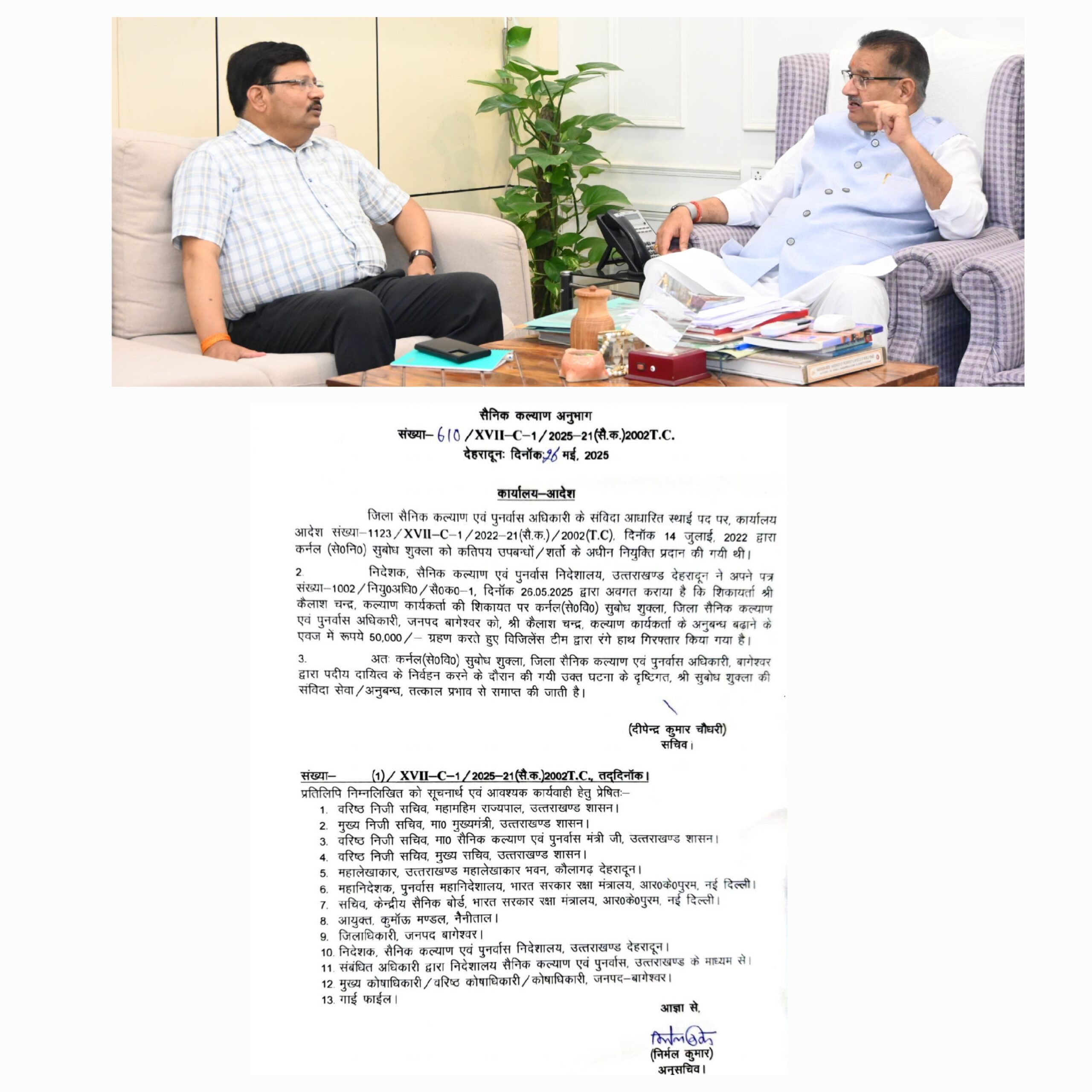 देहरादून, 27 मई। सैनिक कल्याण मंत्री गणेश जोशी ने बागेश्वर के जिला सैनिक कल्याण अधिकारी द्वारा रिश्वत लेने के प्रकरण का संज्ञान लेते हुए कड़ा निर्णय लिया है। उन्होंने सैनिक कल्याण विभाग के सचिव को निर्देश जारी करते हुए सम्बंधित जिला सैनिक कल्याण अधिकारी कर्नल सुबोध शुक्ला (सेवानिवृत्त) को तत्काल प्रभाव से बर्खास्त करने के निर्देश दिए। सैनिक कल्याण मंत्री के निर्देशों के बाद जिसका बर्खास्तगी का आदेश भी जारी कर दिया गया है।