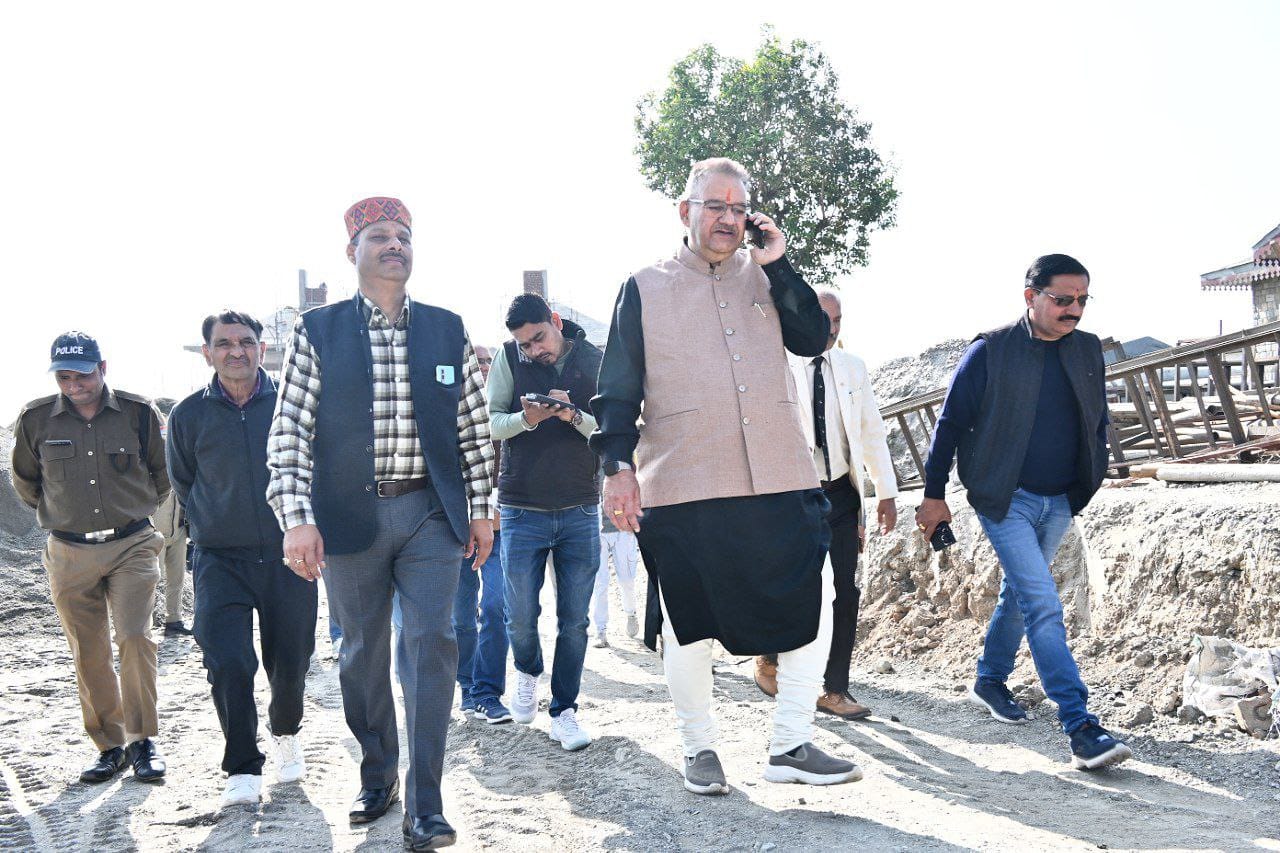 गुनियाल गांव में निर्माणाधीन सैन्यधाम का निरीक्षण करते सैनिक कल्याण मंत्री गणेश जोशी