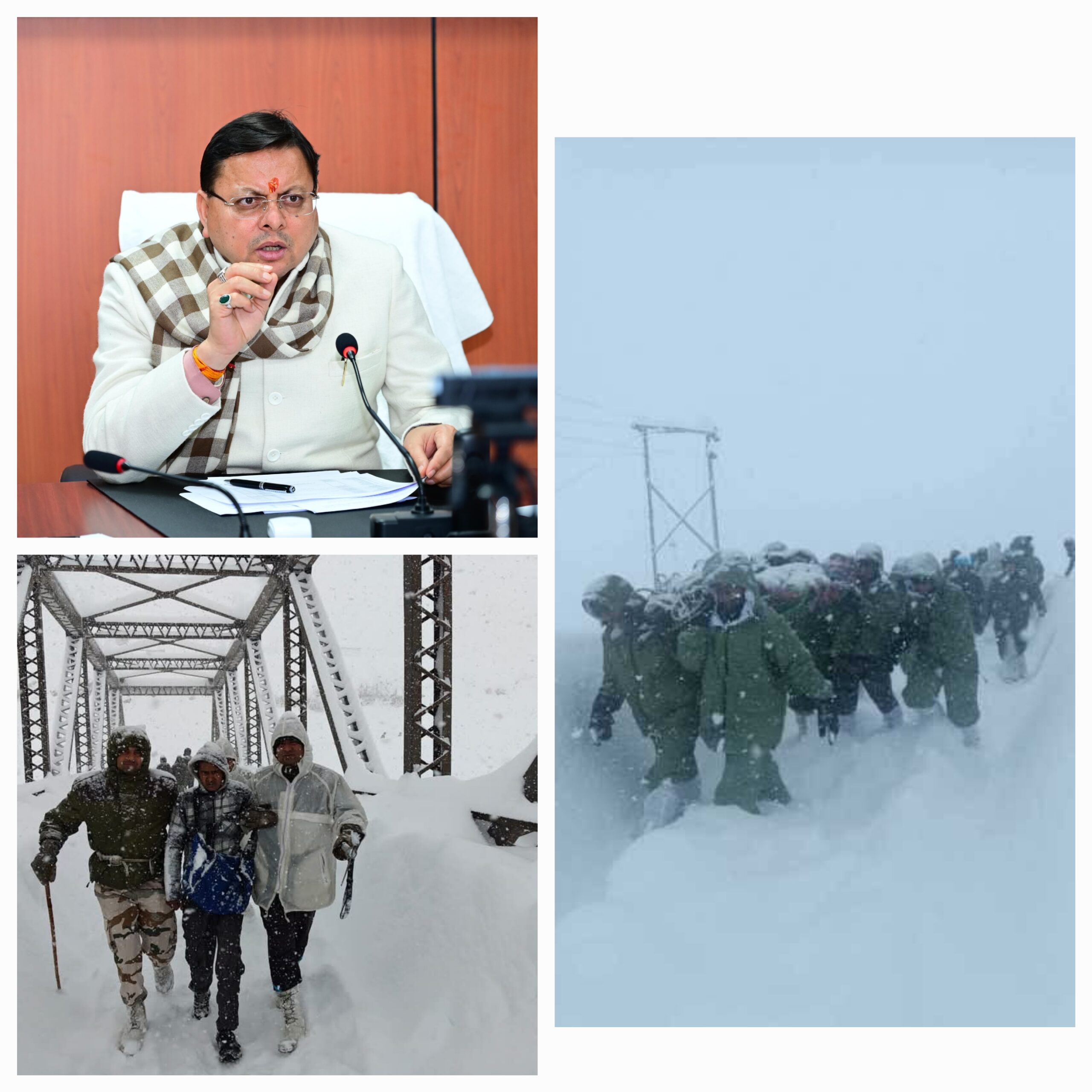 मुख्यमंत्री ने मीडिया से बातचीत में बताया कि आईटीबीपी, सेना, जिला प्रशासन, वायुसेना और अन्य एजेंसियां राहत एवं बचाव कार्य में जुटी हुई हैं। खराब मौसम और कम विजिबिलिटी के कारण हेलीकॉप्टर का संचालन फिलहाल संभव नहीं है, लेकिन स्नो एक्सपर्ट्स की सेवाएं ली जा रही हैं। आईटीबीपी की विशेष टीमें लगातार कार्य कर रही हैं। उन्होंने कहा कि सरकार की सर्वाेच्च प्राथमिकता हिमस्खलन में फंसे लोगों को सुरक्षित निकालना है। प्रभावित लोगों के परिजनों के लिए हेल्पलाइन नंबर भी जारी किया जा रहा है।