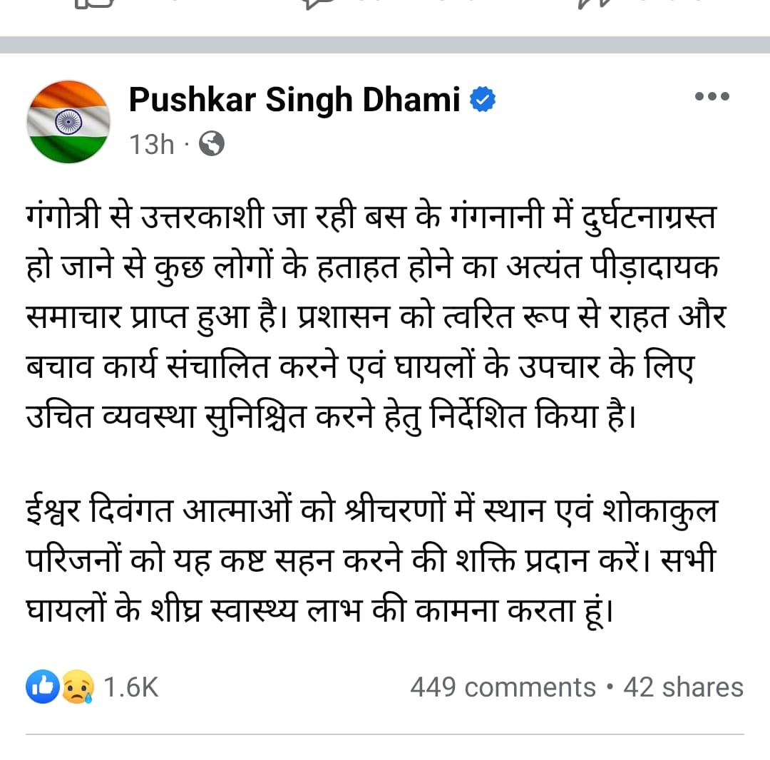 उत्तरकाशी के तहसील भटवाड़ी अंतर्गत गंगोत्री राष्ट्रीय राजमार्ग पर गंगनानी के पास यात्रियों की बस खाई में गिरने के मामले में मुख्यमंत्री पुष्कर सिंह धामी ने स्थानीय प्रशासन को तेजी से राहत-बचाव कार्य चलाने के निर्देश दिए हैं।