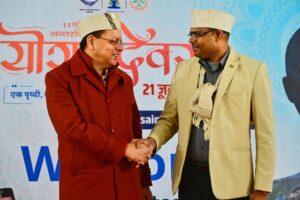 मुख्यमंत्री श्री पुष्कर सिंह धामी ने शुक्रवार को भराड़ीसैंण, गैरसैंण में अंतर्राष्ट्रीय योग दिवस की पूर्व संध्या पर आयोजित कार्यक्रम में प्रतिभाग करते हुए सभी विदेशी राजनयिकों और सुप्रसिद्ध योगाचार्य का स्वागत किया। उन्होंने इस दौरान सभी को प्रतीक चिन्ह और उत्तराखंडी टोपी देकर सम्मानित भी किया।