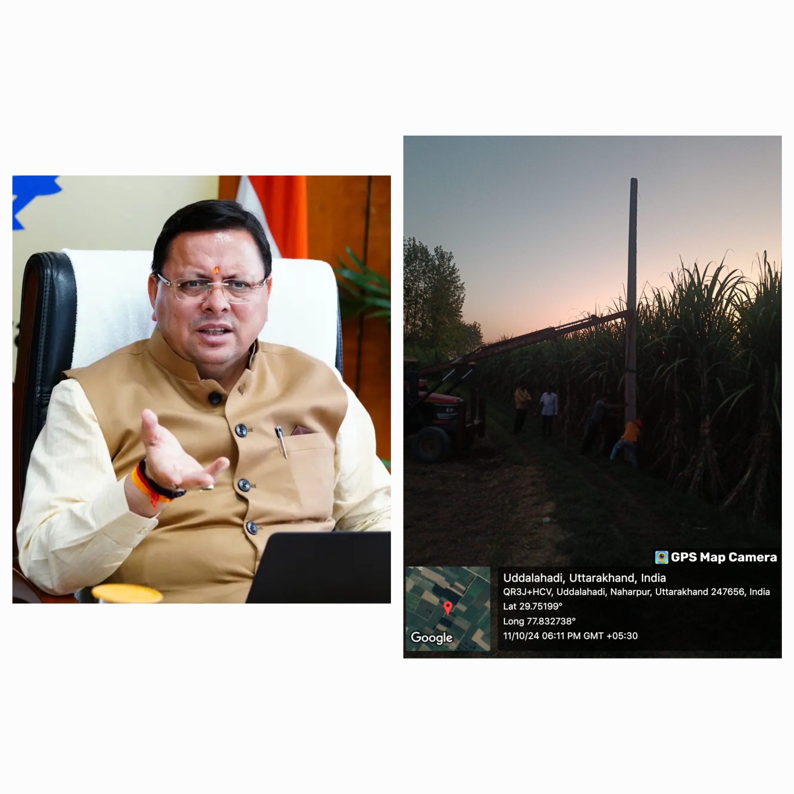 मुख्यमंत्री आवास स्थित मुख्य सेवक सदन में शुक्रवार को हरिद्वार के मंगलौर से आये किसान द्वारा खेतों में सिंचाई हेतु ट्यूबवेल के लिए बिजली का खंभा लगाने का मुख्यमंत्री से अनुरोध किया गया। मुख्यमंत्री ने किसान की समस्या का तत्काल संज्ञान लिया। नतीजा आज के आज ही उसके खेत में विभाग ने बिजली का खंभा लगवा दिया।