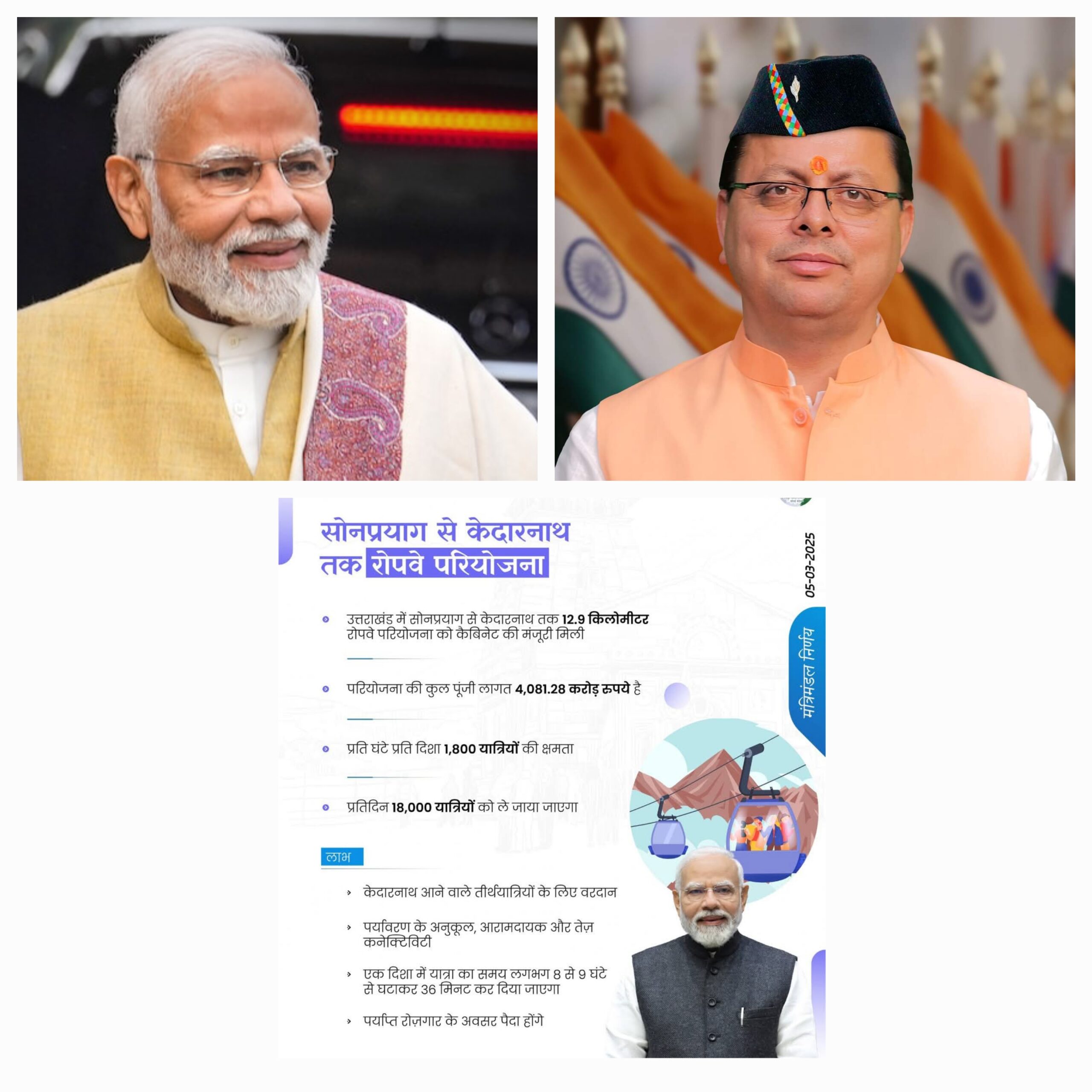 यह रोपवे परियोजना केदारनाथ आने वाले तीर्थयात्रियों के लिए वरदान होगी क्योंकि यह पर्यावरण-अनुकूल, आरामदायक और तेज़ कनेक्टिविटी प्रदान करेगी और एक दिशा में यात्रा का समय लगभग 8 से 9 घंटे से घटकर लगभग 36 मिनट कर देगी