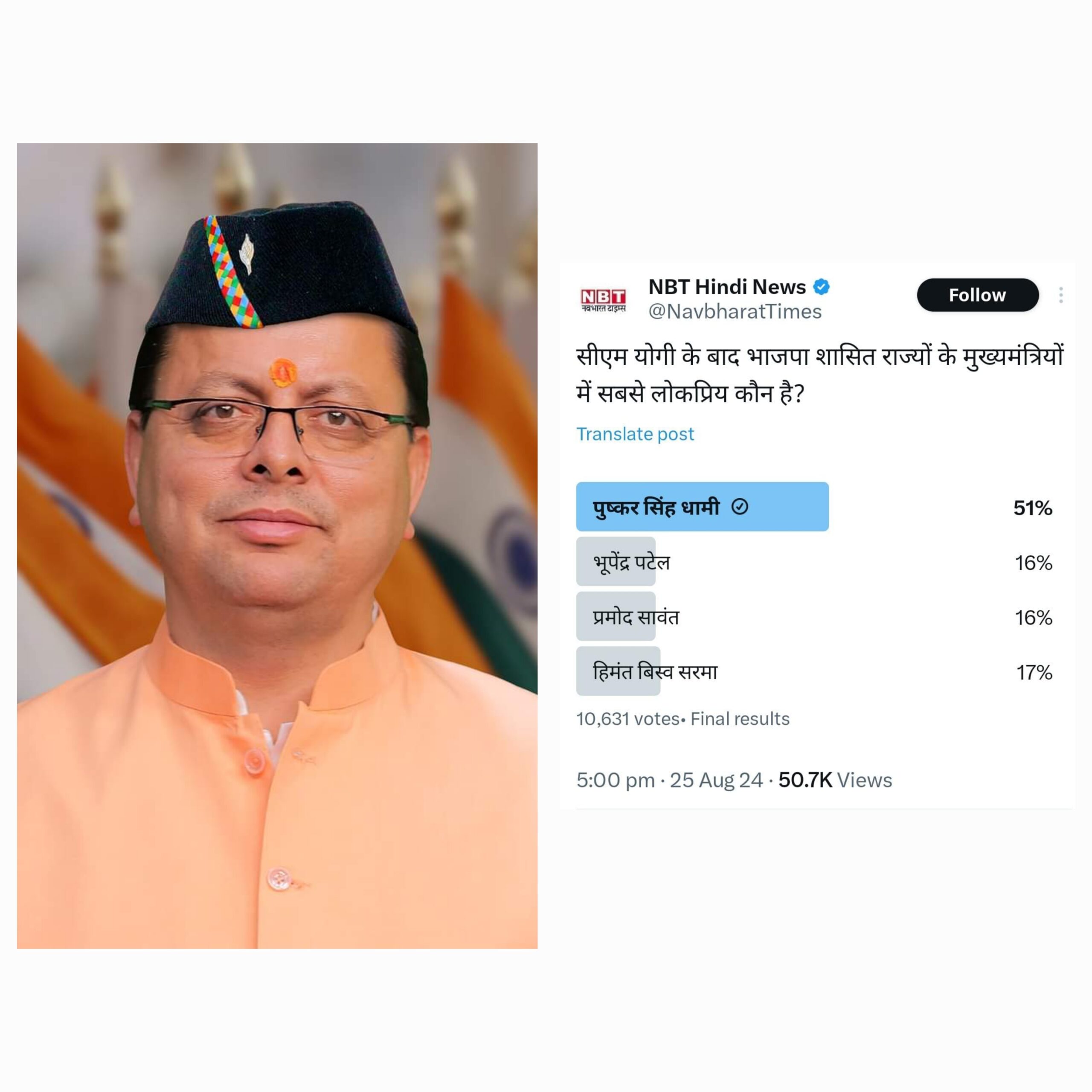 बड़ी खबर: प्रतिष्ठित मीडिया समूह नव भारत टाइम्स के सर्वे में टॉप पर मुख्यमंत्री धामी
