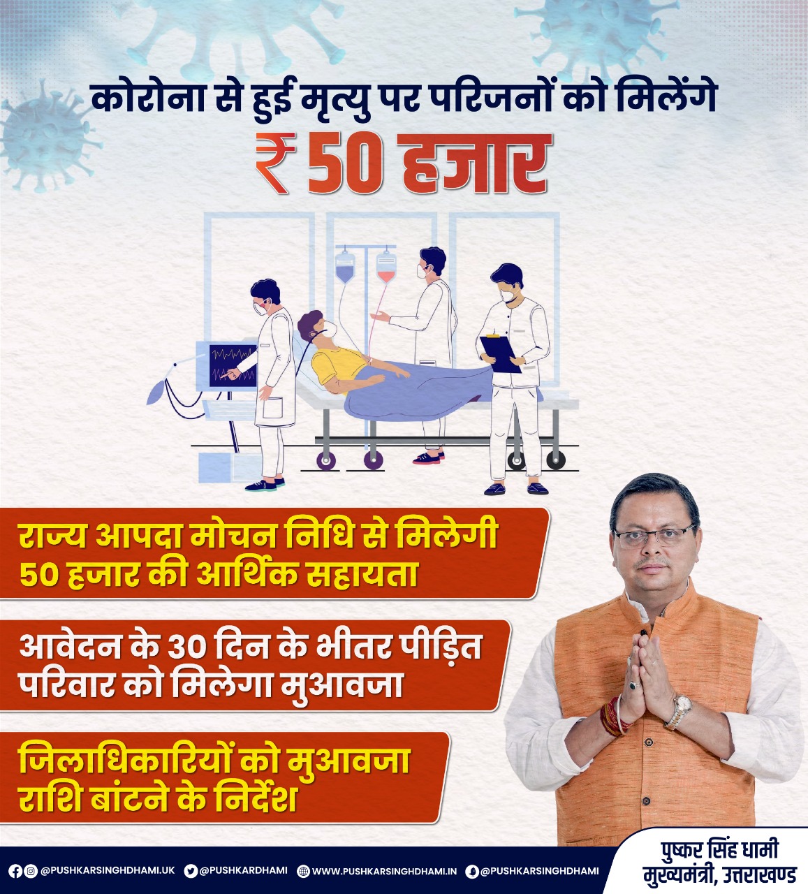 मुख्यमंत्री पुष्कर सिंह धामी ने कहा है कि कोविड-19 से मृत्यु पर राज्य सरकार मृतक के परिजनों को 50 हजार रूपये का मुआवजा देगी। यह आर्थिक सहायता ‘राज्य आपदा मोचन निधि’ से प्रदान की जाएगी। मुख्यमंत्री ने कहा कि राज्य सरकार वैश्विक महामारी कोविड-19 से जान गंवाने वाले लोगों के परिजनों के साथ खड़ी है।*