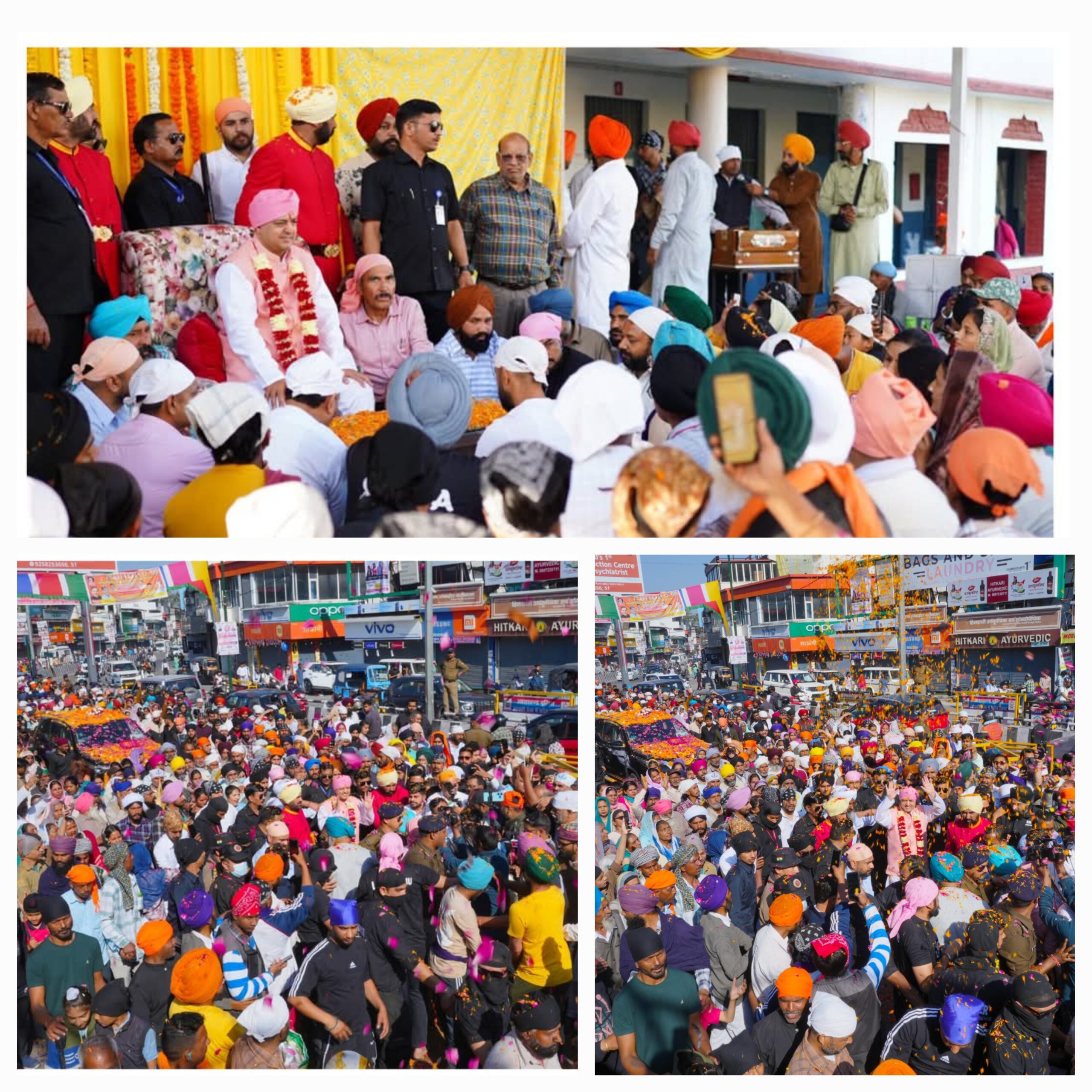 फूल बरसांदी जांवा राह तेरे फुल बरसांदी जांवा……., किवंे करां, किवें करा तेरी सेवा मालका किवें करां…..जे बाबा मैं खुद ही आंवा, जे बाबा मैं खुद ही आंवा मैं किस्मद दा माडा मालका किवंे करां… जैसे गुरु भक्ति के भजनों से नगर परिक्रमां मंे संगत रमी रही।